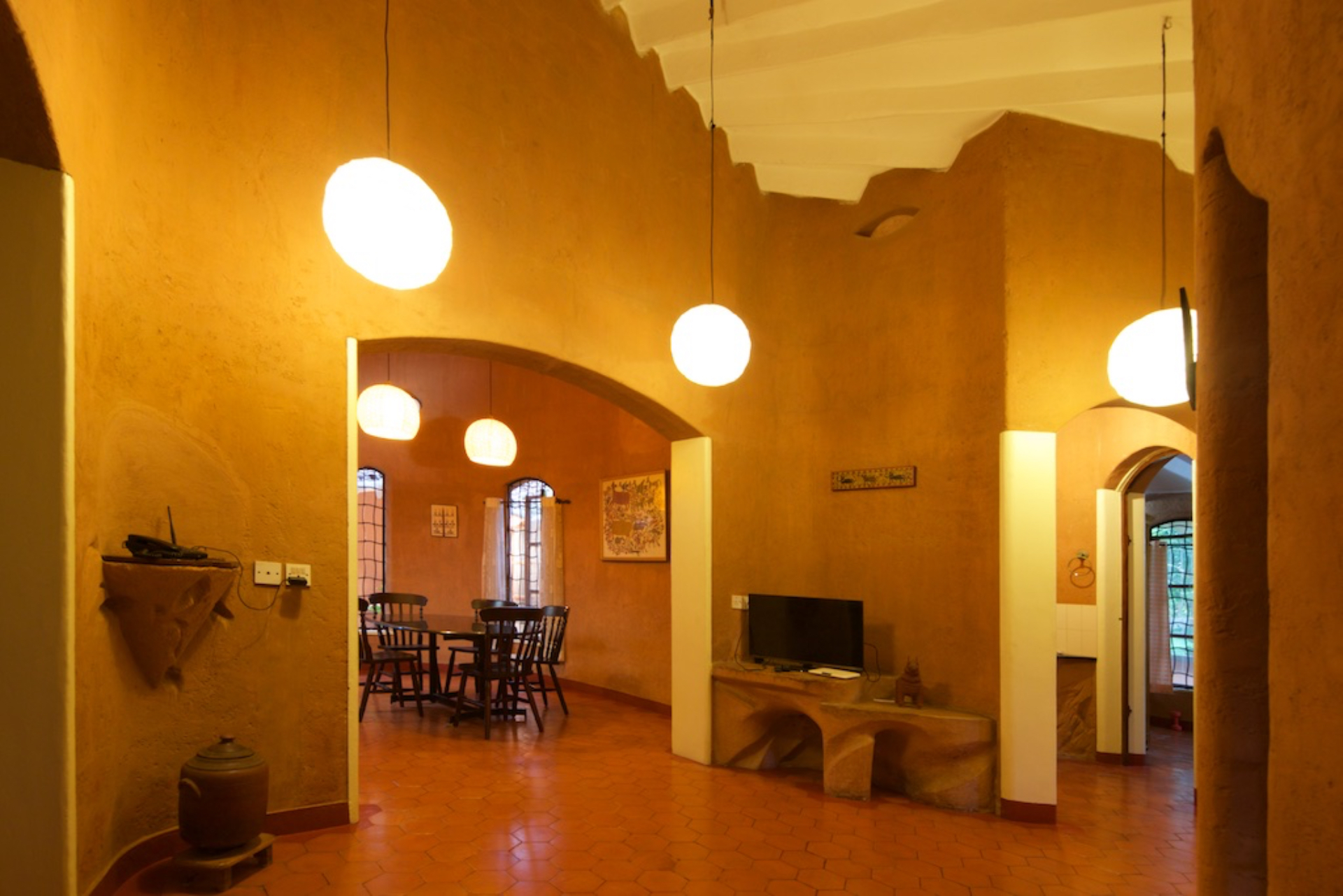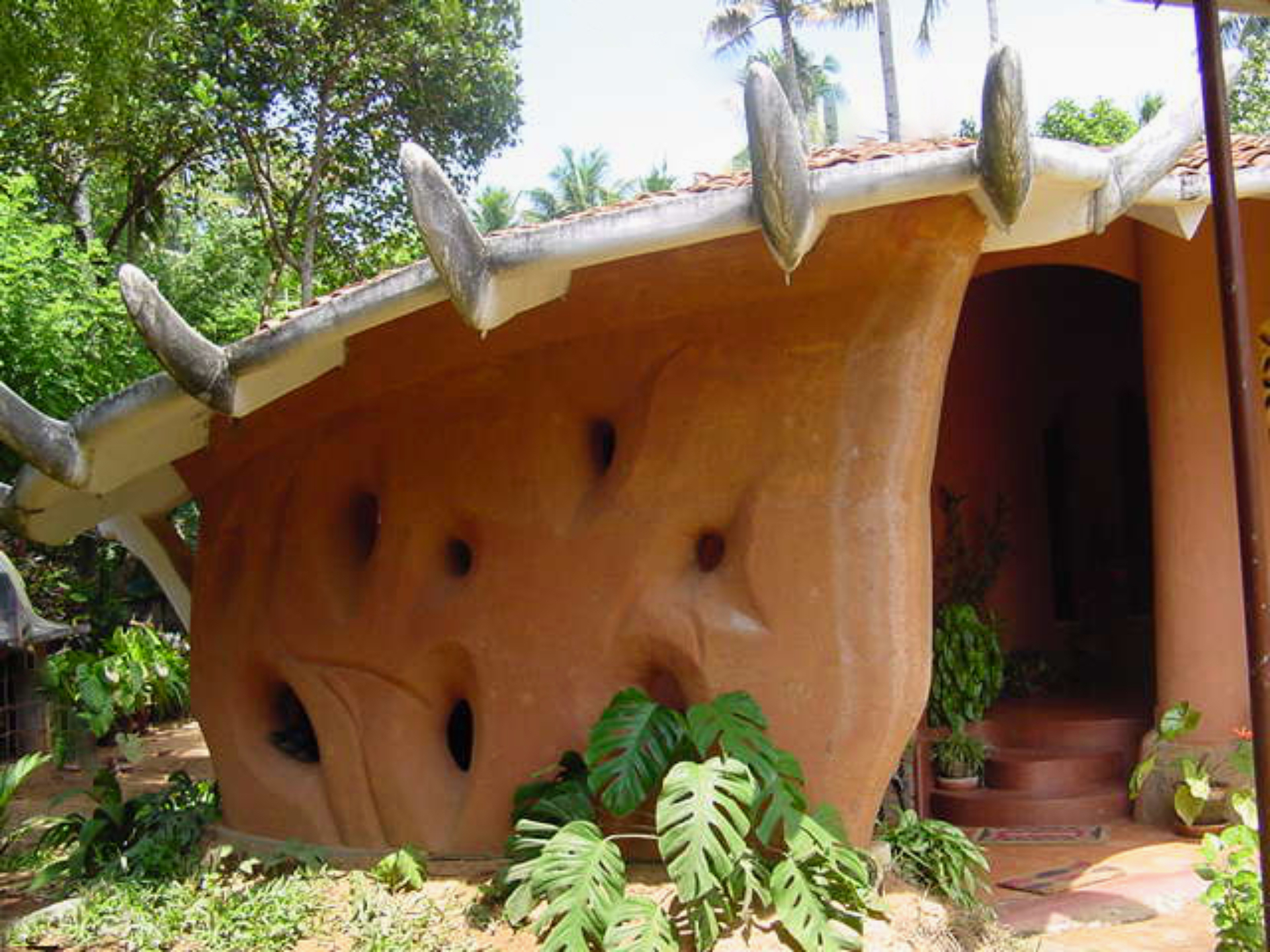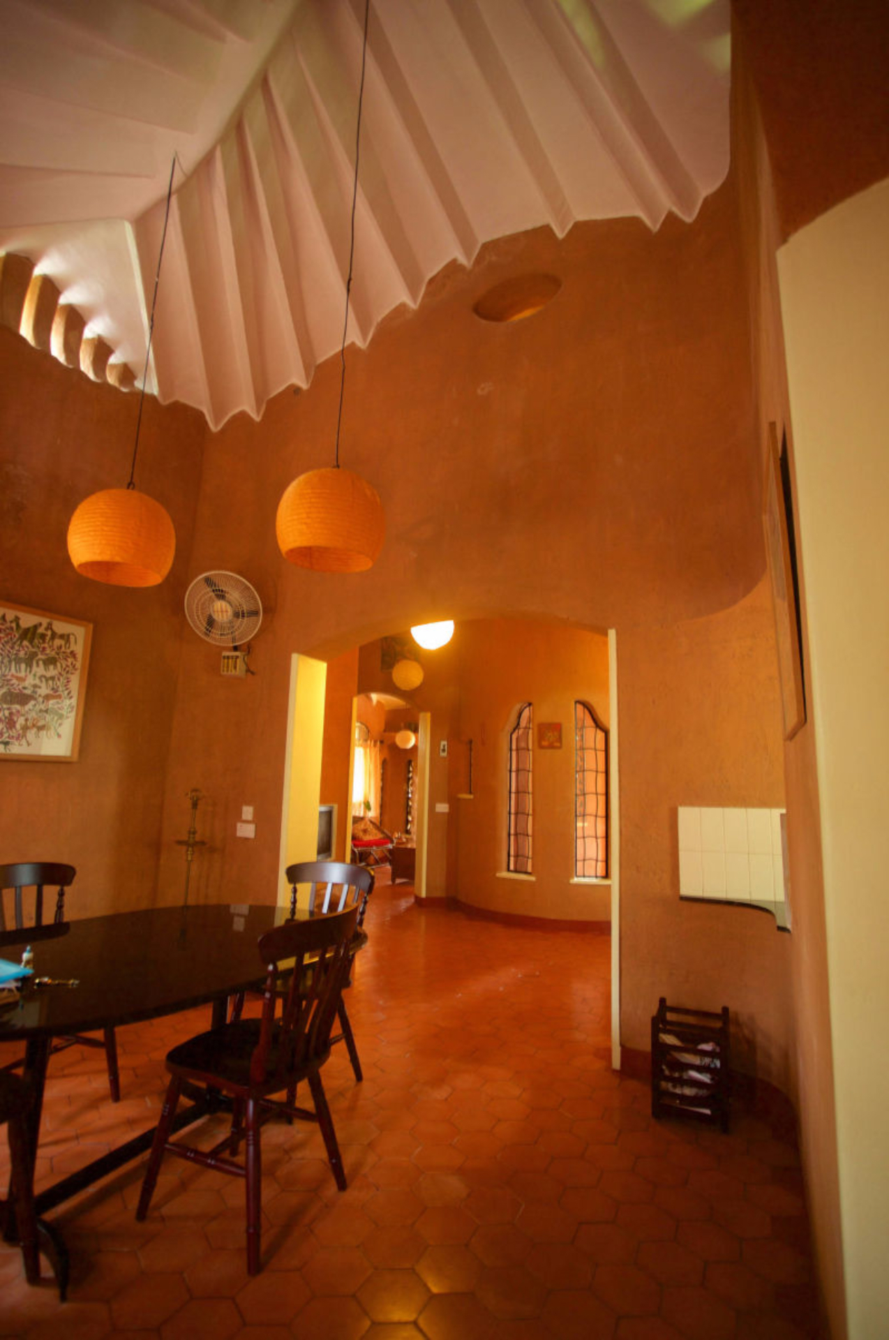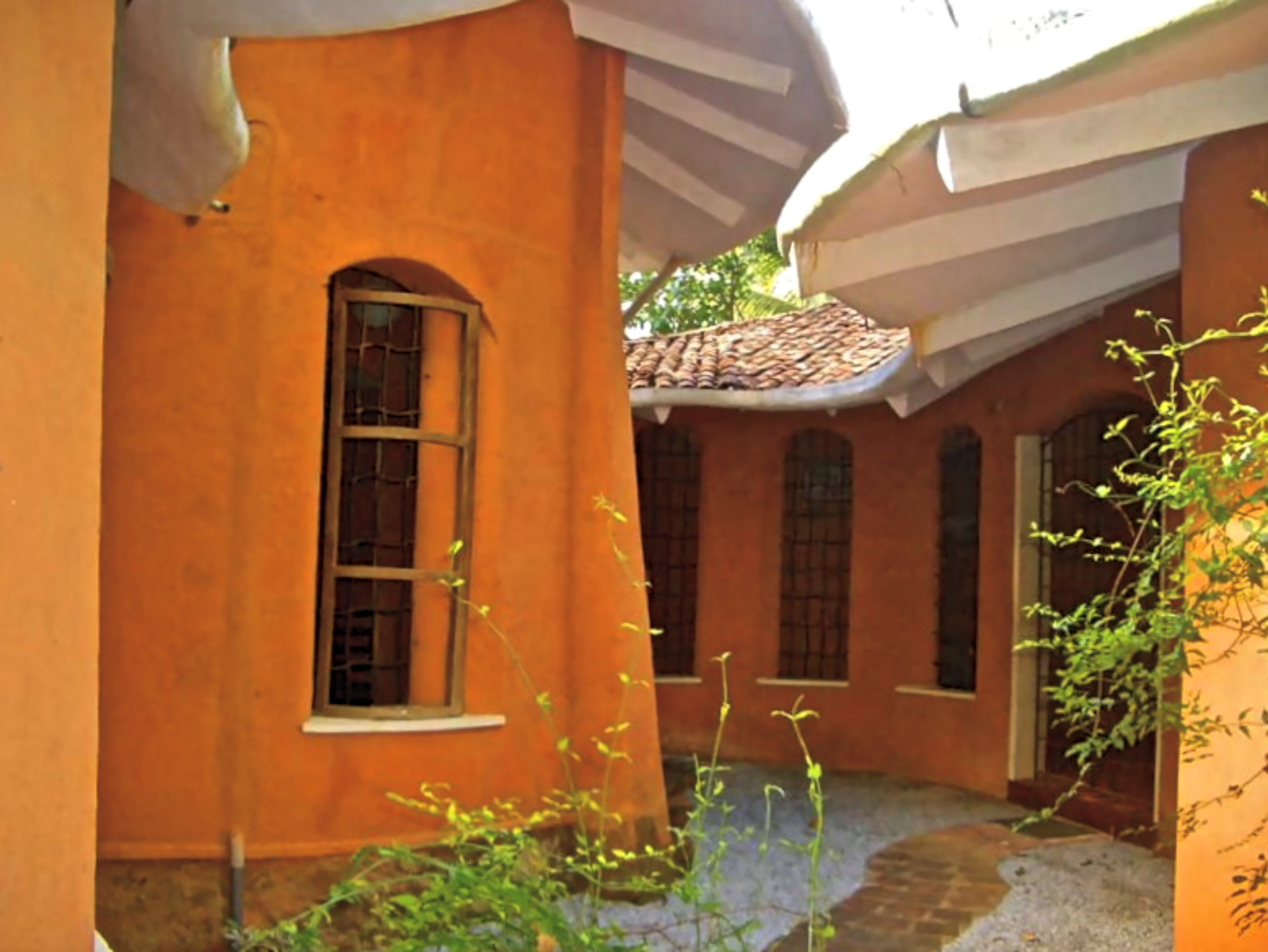 Rising like a mushroom within a lush green coconut grove canopy, the house is designed creating mysterious spaces generating curiosity all along, leaving inhabitants enraptured. The curvaceous form is artistically moulded warping around a courtyard, 4 bedrooms, kitchen, dining room and a living space that blend the warm shades of earth and vegetative green to add a cozy overall tone to the house. It was built of 42 truckloads of mud procured from the excavations of an irrigation canal.