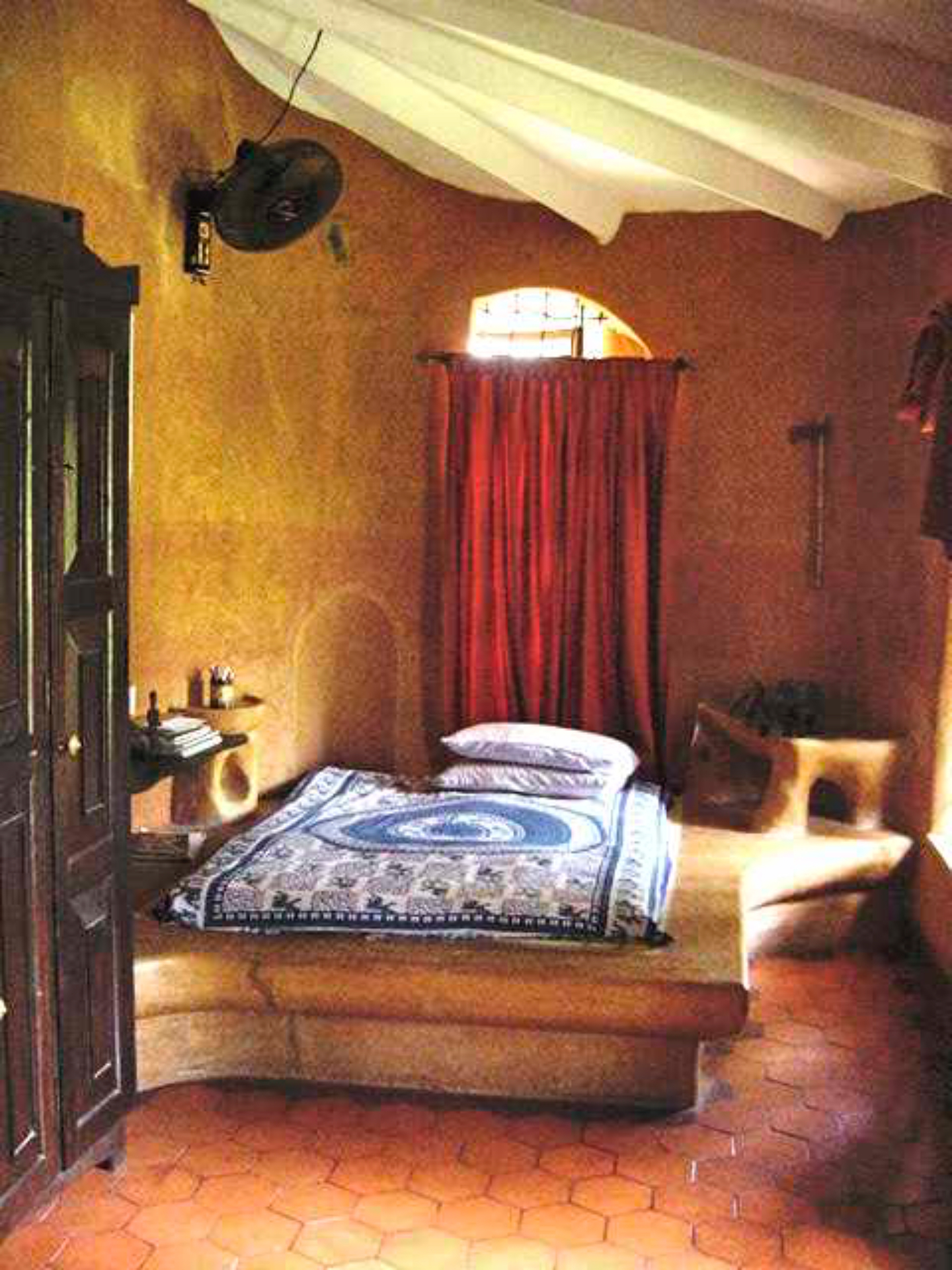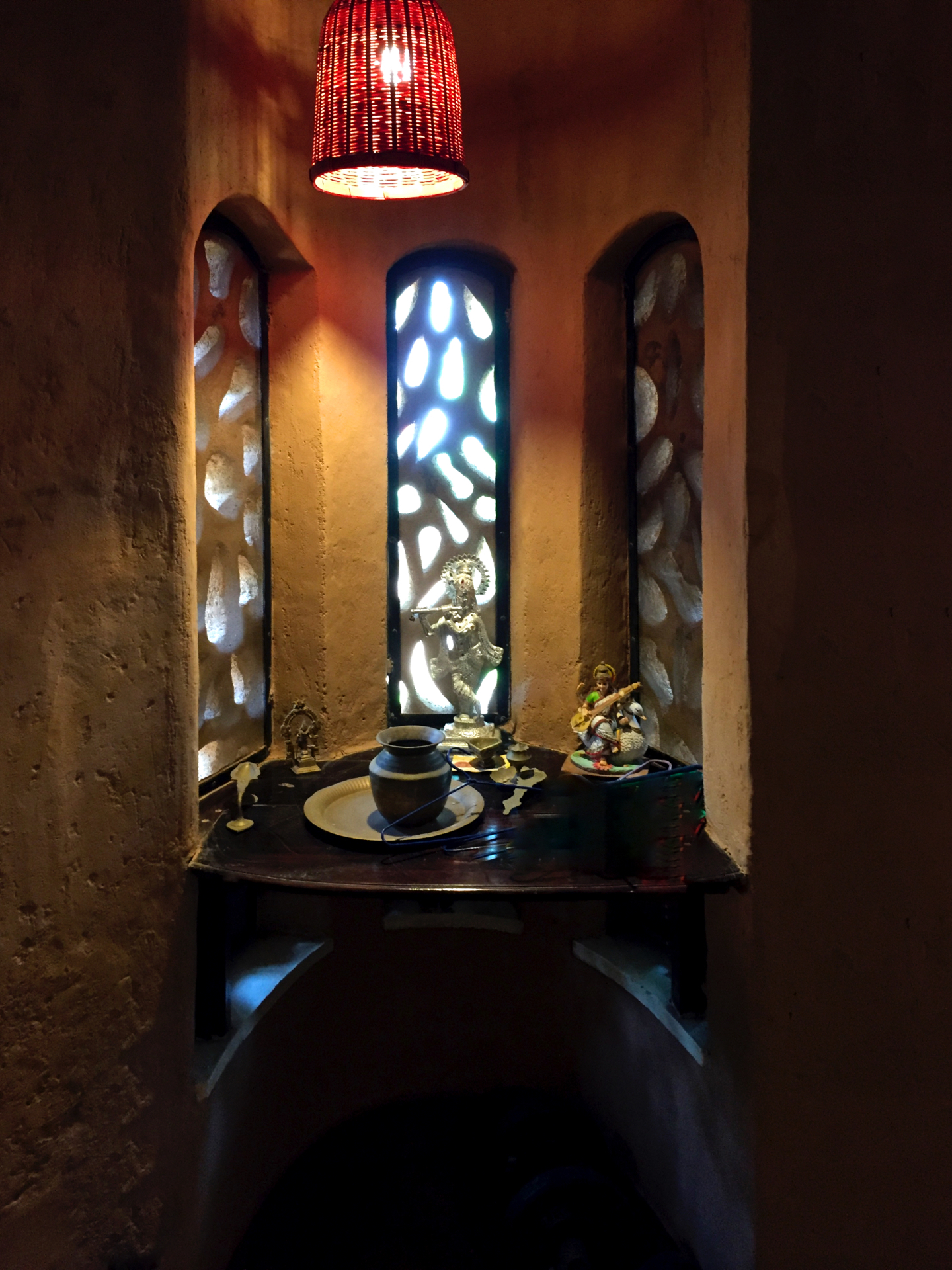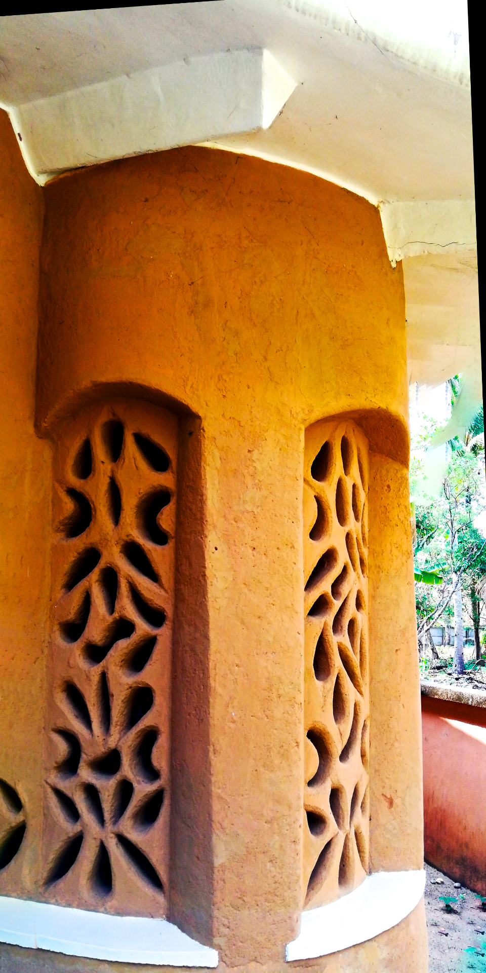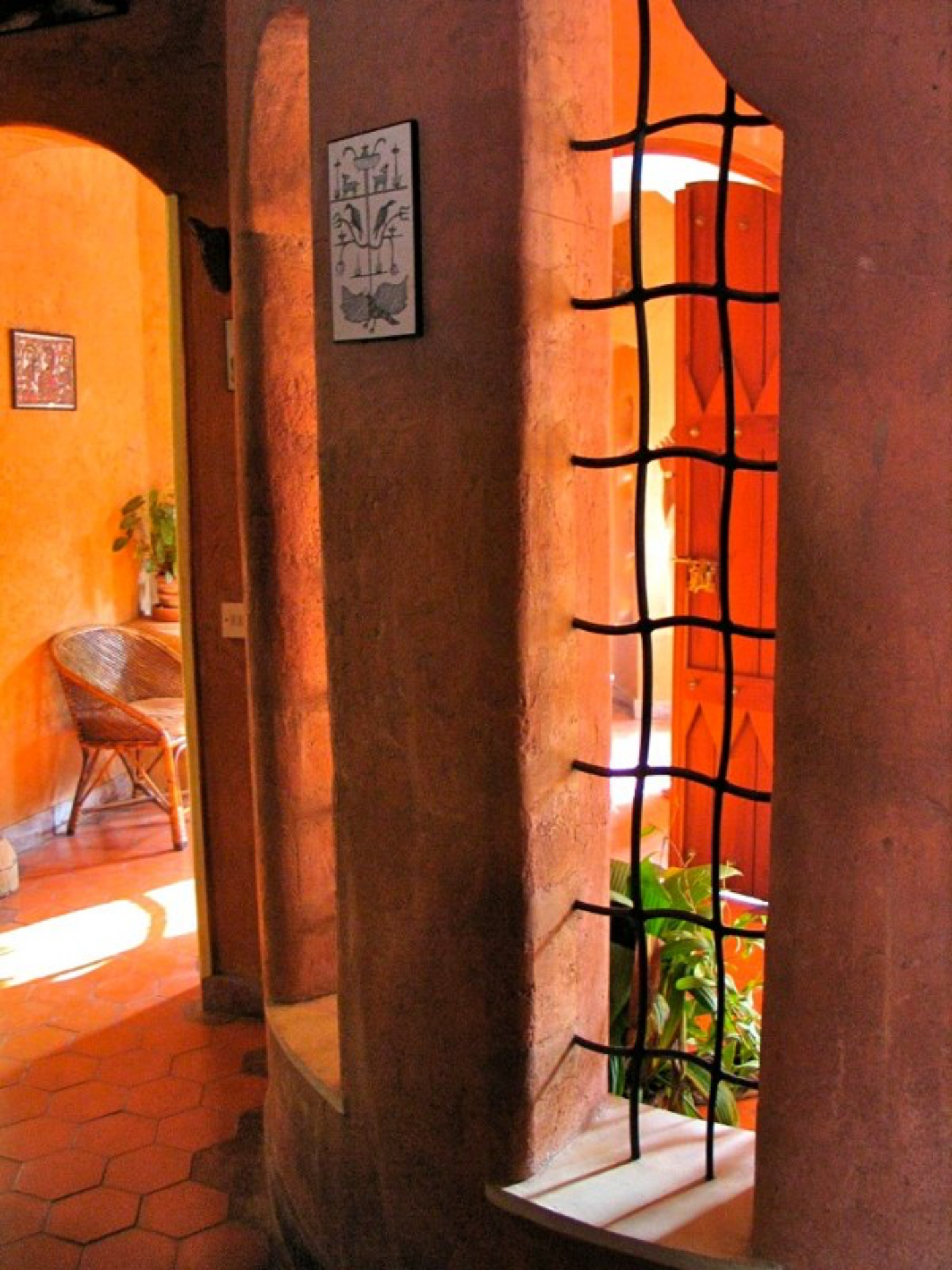 Rising like a mushroom within a lush green coconut grove canopy, the house is designed creating mysterious spaces generating curiosity all along, leaving inhabitants enraptured. The curvaceous form is artistically moulded warping around a courtyard, 4 bedrooms, kitchen, dining room and a living space that blend the warm shades of earth and vegetative green to add a cozy overall tone to the house. It was built of 42 truckloads of mud procured from the excavations of an irrigation canal.