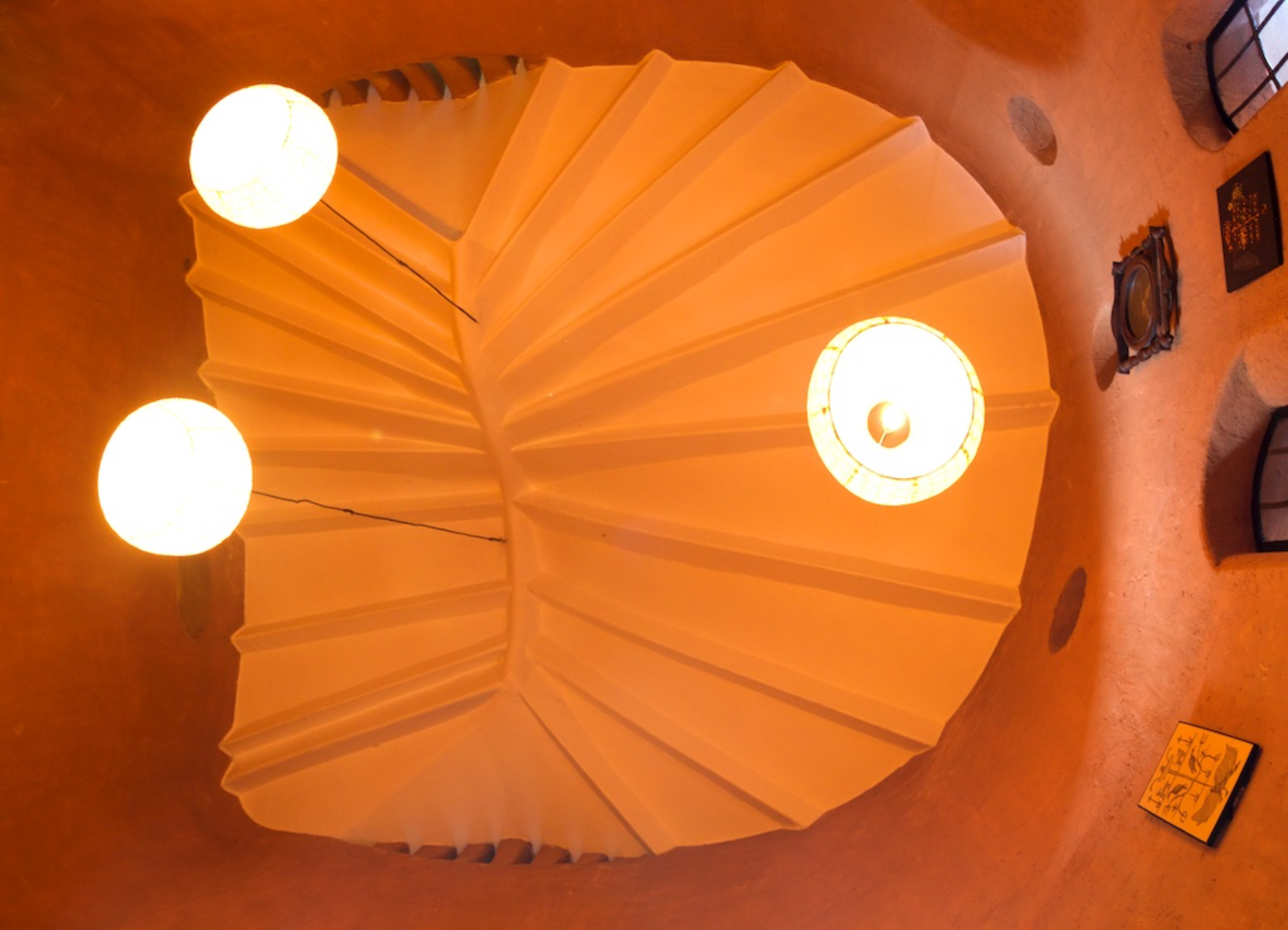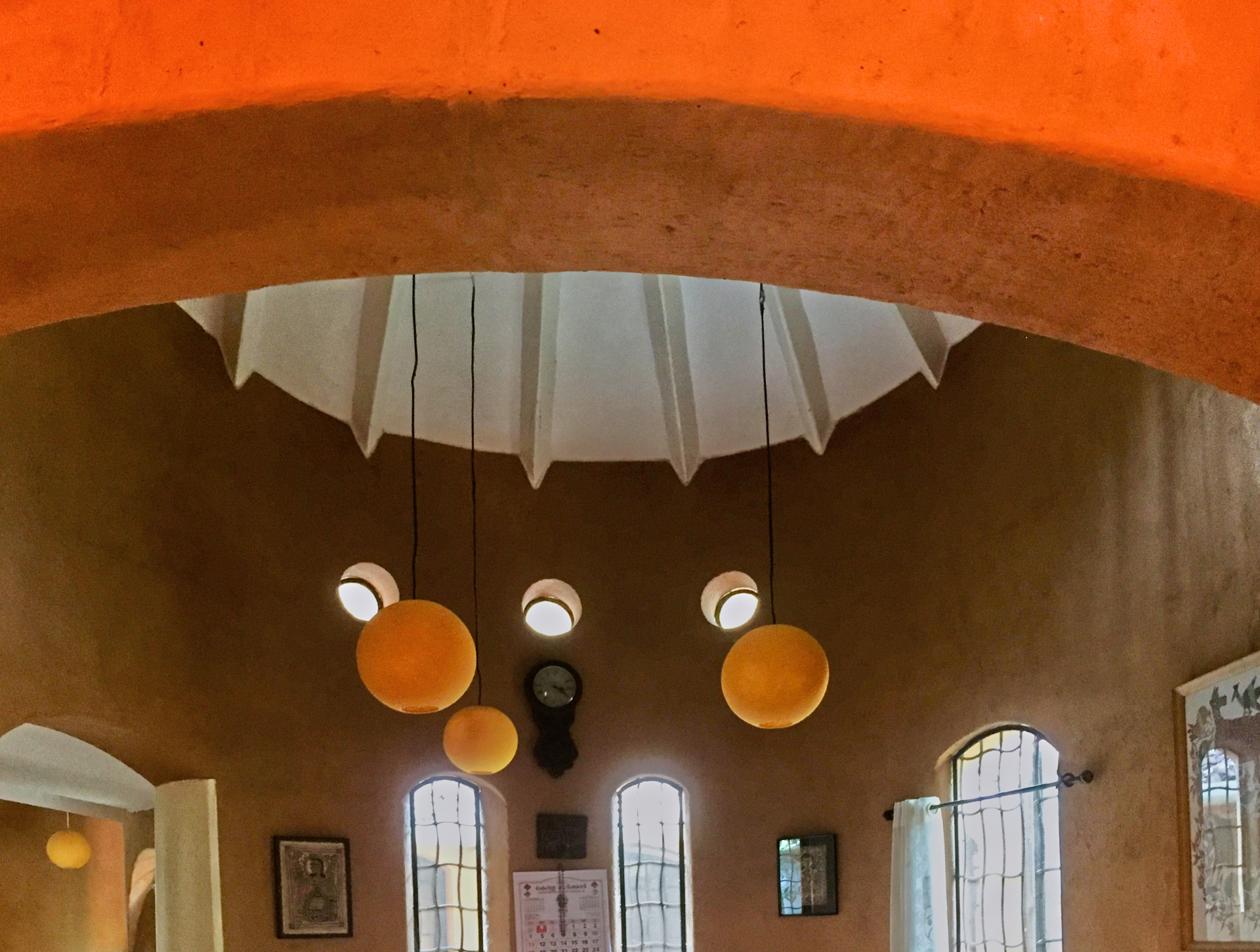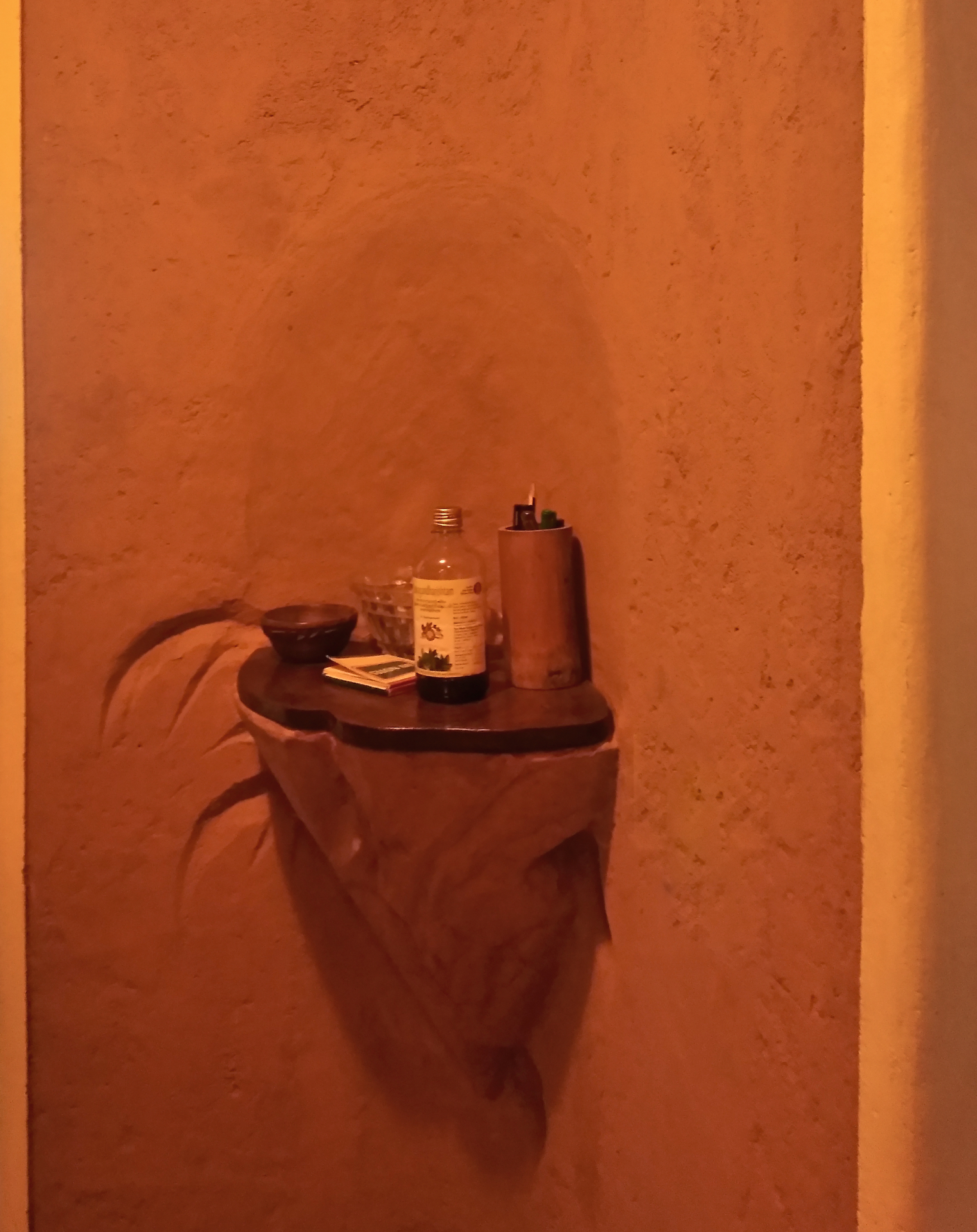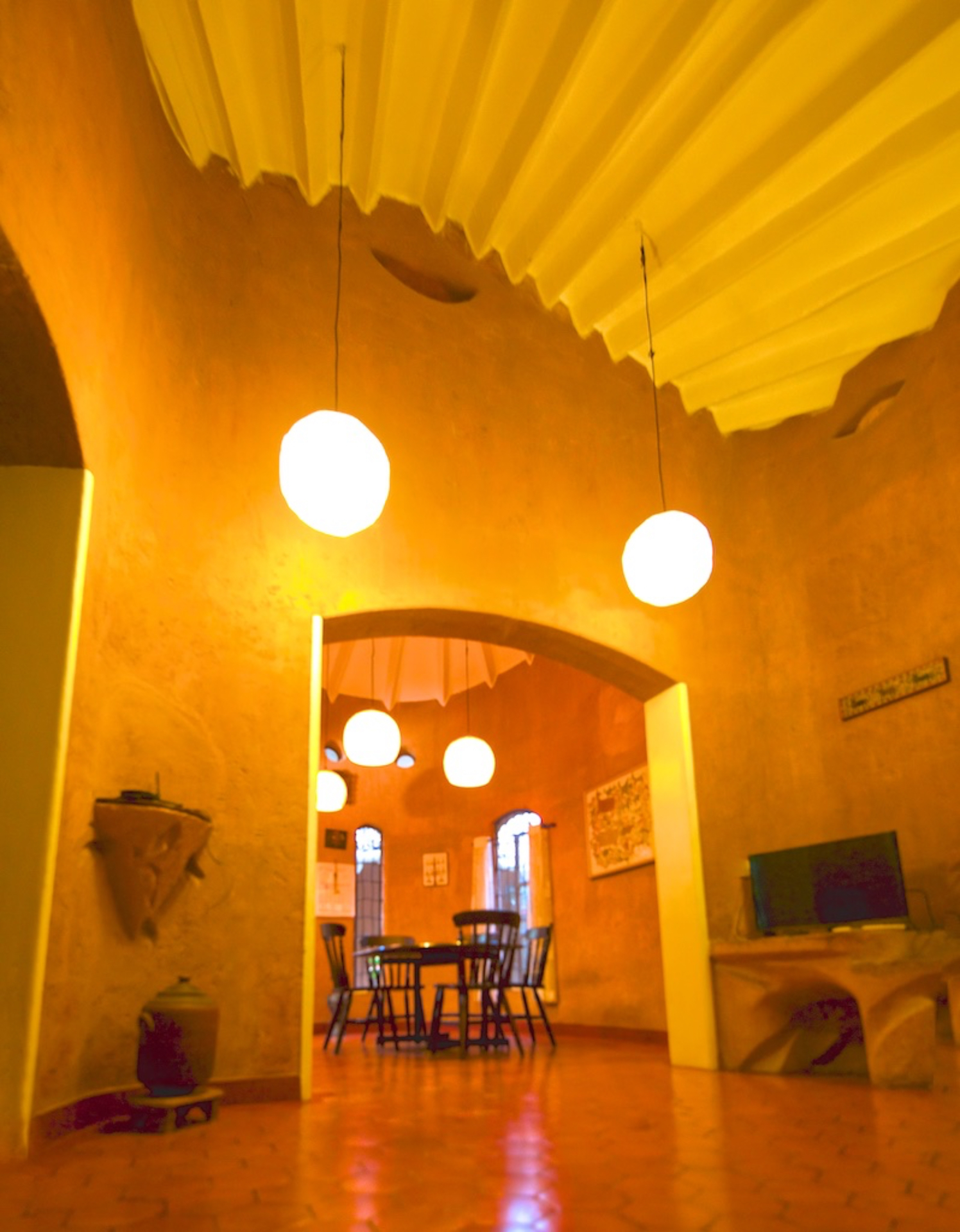 Rising like a mushroom within a lush green coconut grove canopy, the house is designed creating mysterious spaces generating curiosity all along, leaving inhabitants enraptured. The curvaceous form is artistically moulded warping around a courtyard, 4 bedrooms, kitchen, dining room and a living space that blend the warm shades of earth and vegetative green to add a cozy overall tone to the house. It was built of 42 truckloads of mud procured from the excavations of an irrigation canal.