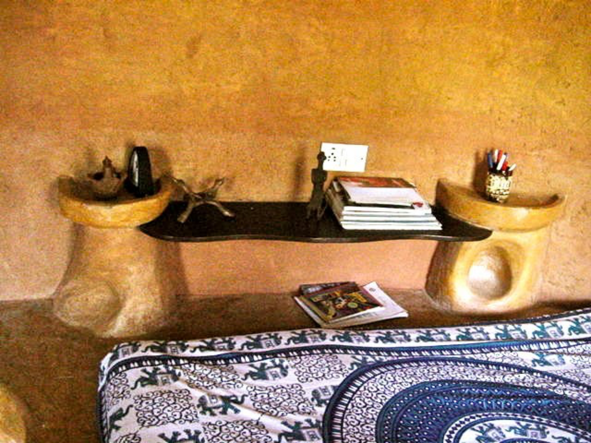 The carved our niches and built-in furniture reduced the cost as well as maintenance. in 1996, The cost of construction worked out to Rs. 300 per square foot (). The house took two years to complete.