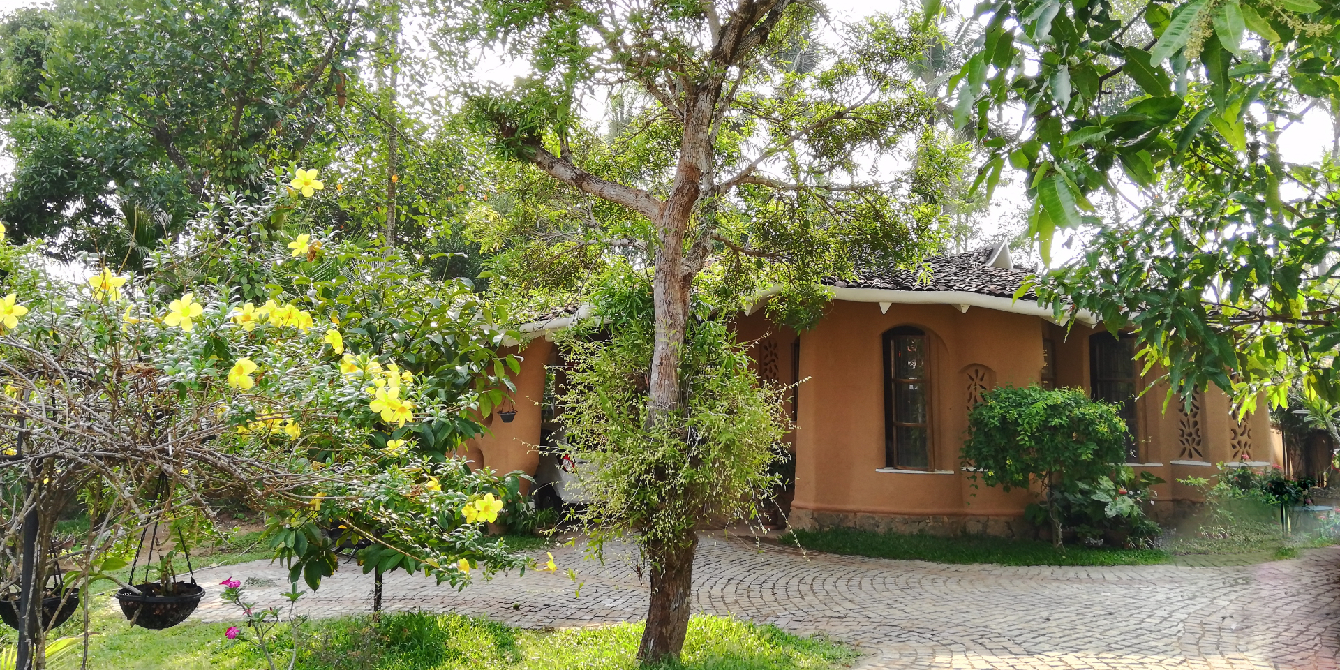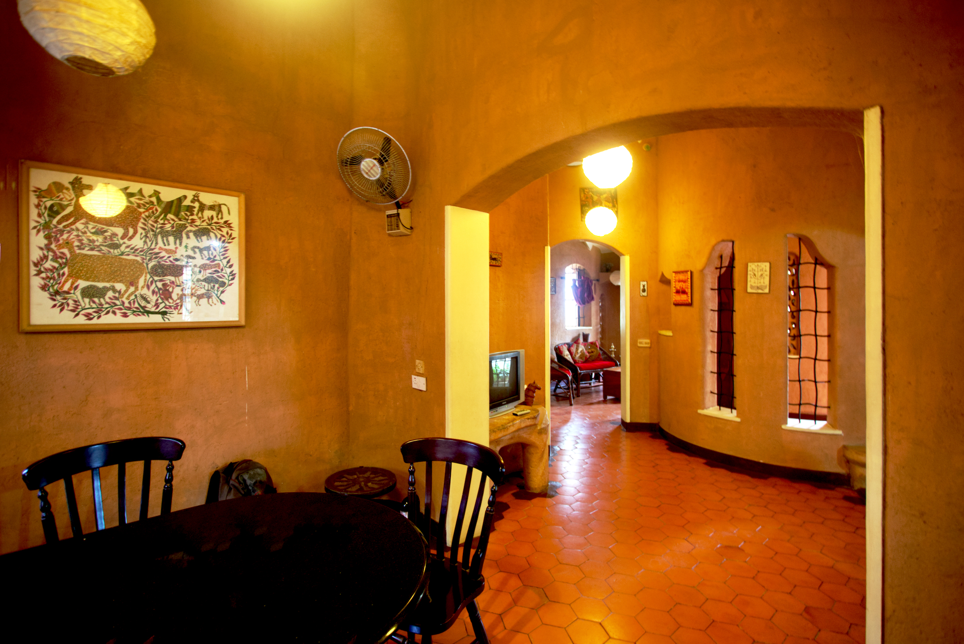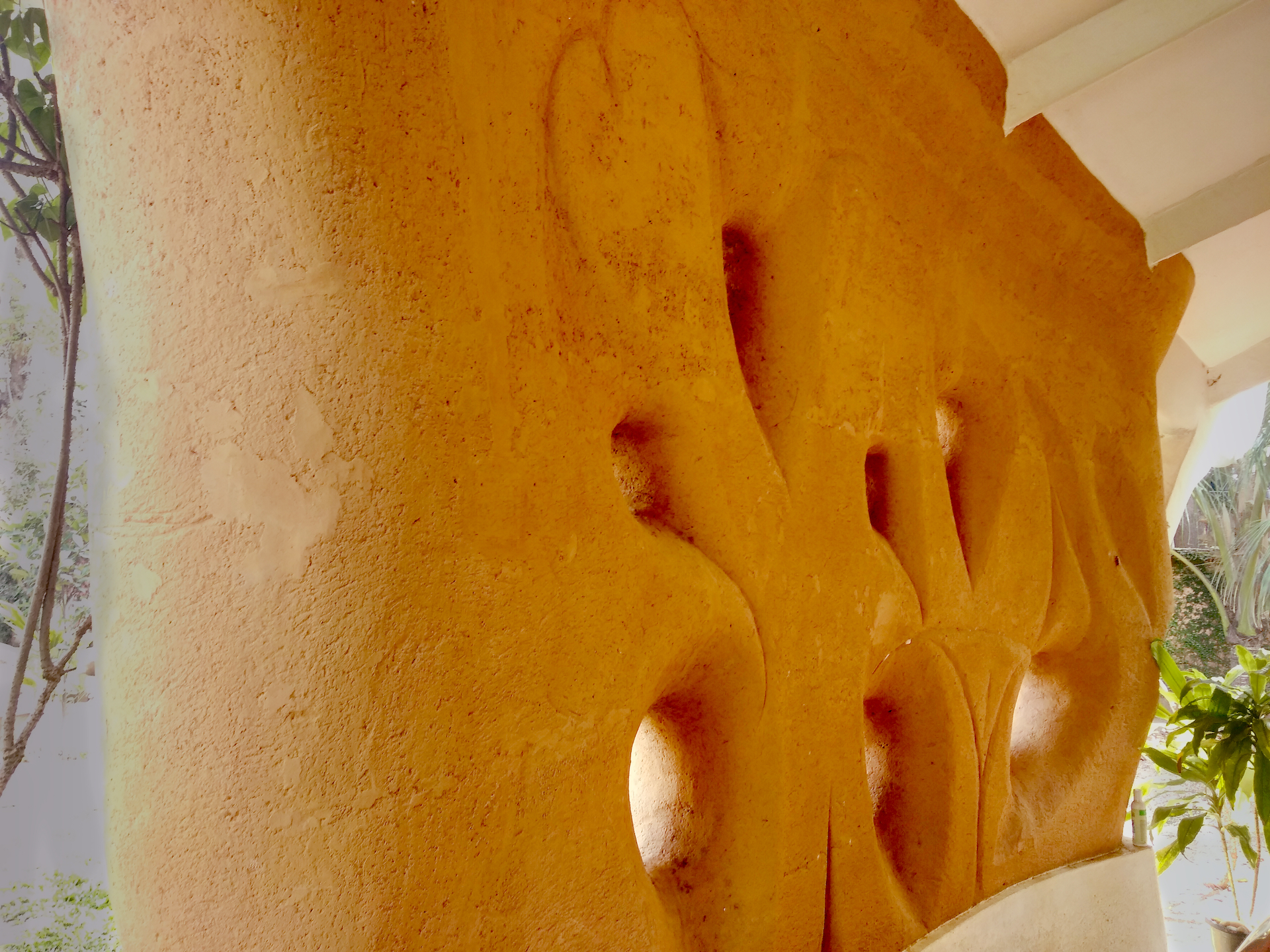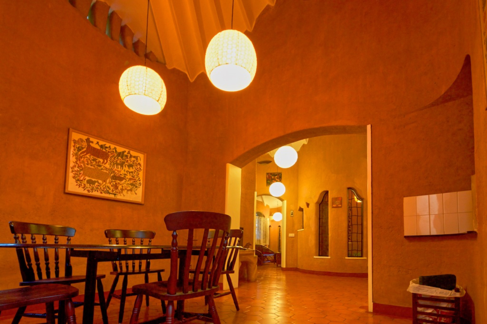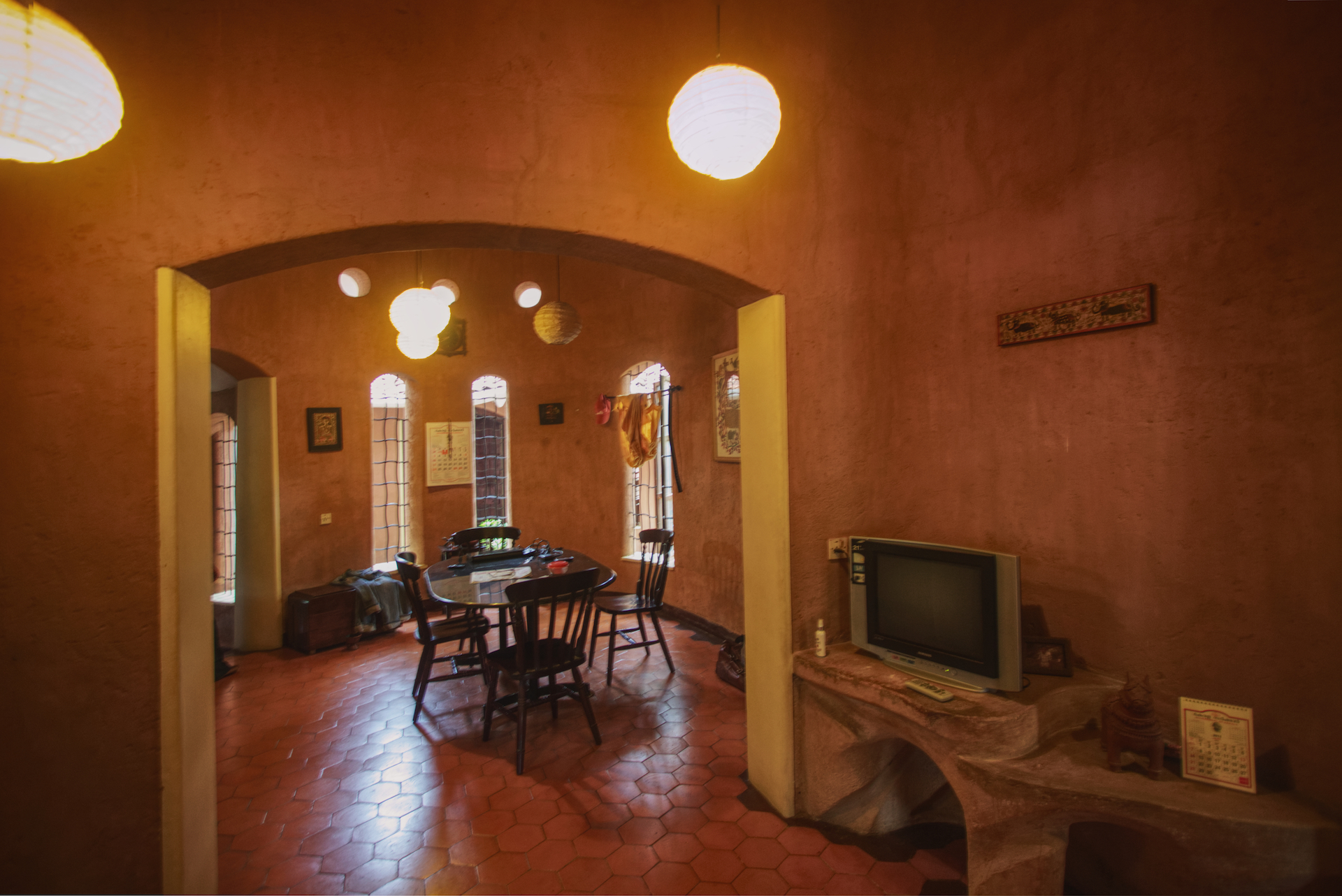 Rising like a mushroom within a lush green coconut grove canopy, the house is designed creating mysterious spaces generating curiosity all along, leaving inhabitants enraptured. The curvaceous form is artistically moulded warping around a courtyard, 4 bedrooms, kitchen, dining room and a living space that blend the warm shades of earth and vegetative green to add a cozy overall tone to the house. It was built of 42 truckloads of mud procured from the excavations of an irrigation canal.
