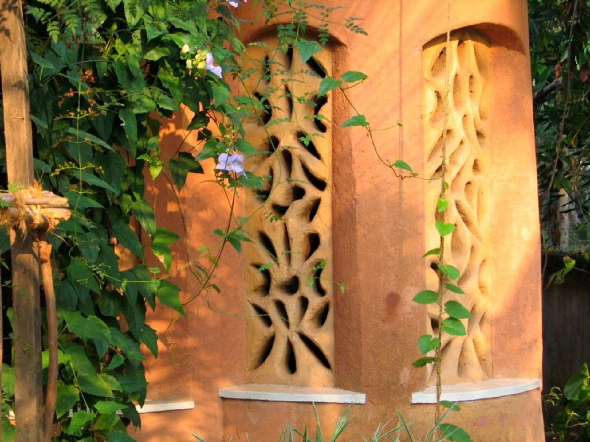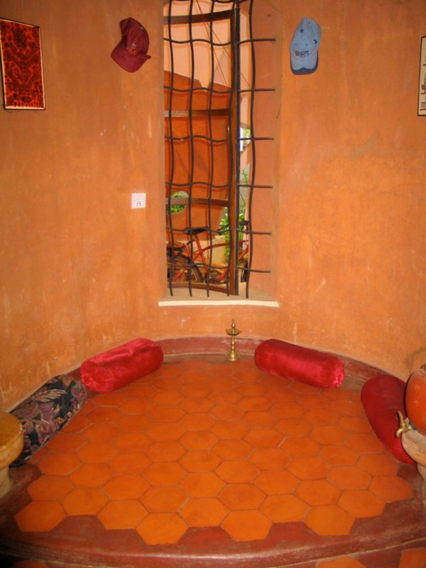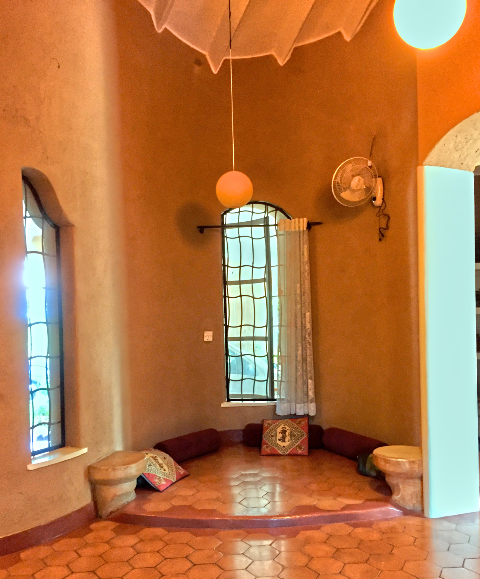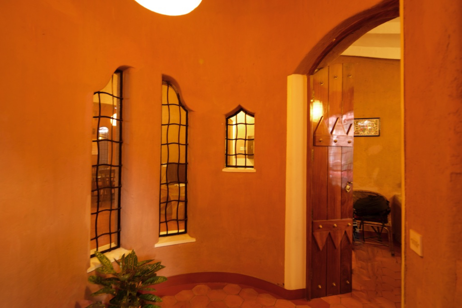 Rising like a mushroom within a lush green coconut grove canopy, the house is designed creating mysterious spaces generating curiosity all along, leaving inhabitants enraptured. The curvaceous form is artistically moulded warping around a courtyard, 4 bedrooms, kitchen, dining room and a living space that blend the warm shades of earth and vegetative green to add a cozy overall tone to the house. It was built of 42 truckloads of mud procured from the excavations of an irrigation canal.